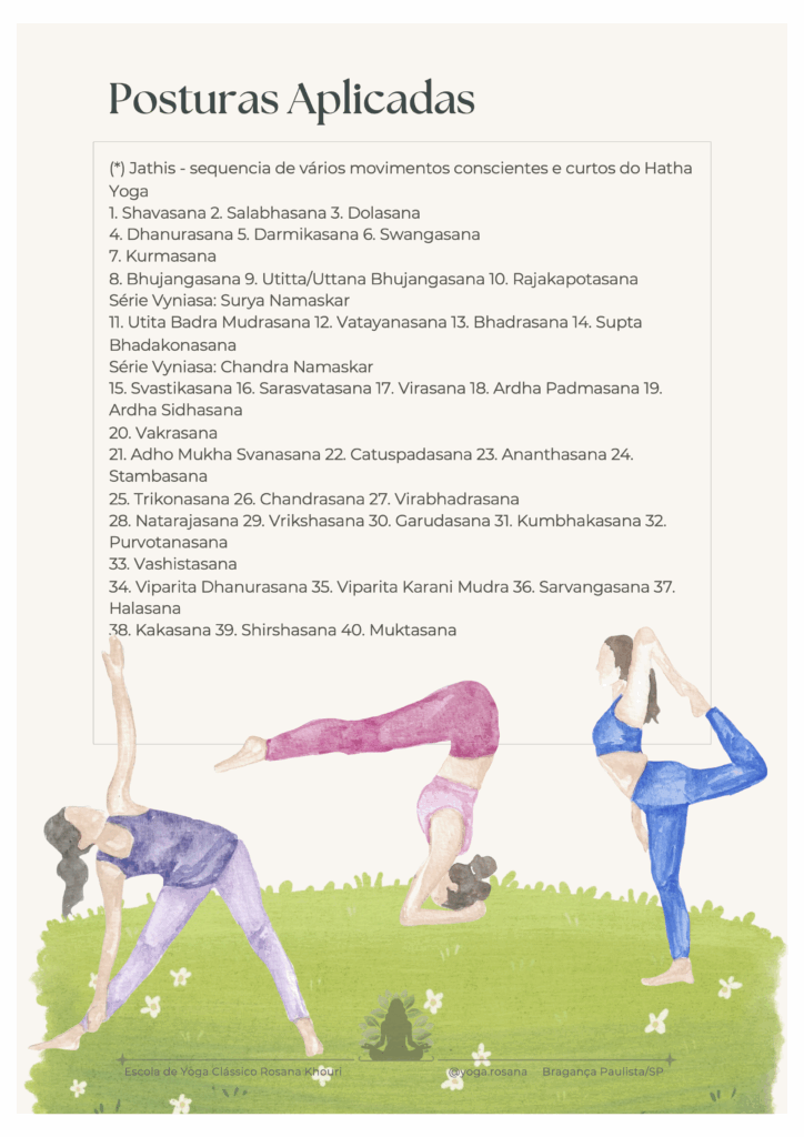 - No total serão desenvolvidos 40 (quarenta) asanas matrix, que por sua vez apresentam diversas variantes. Mais Jathis e as séries vyniasa: Surya